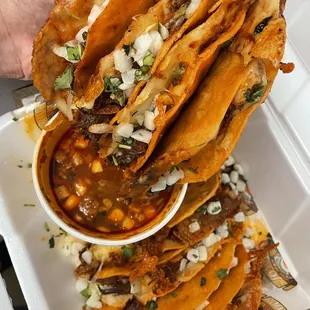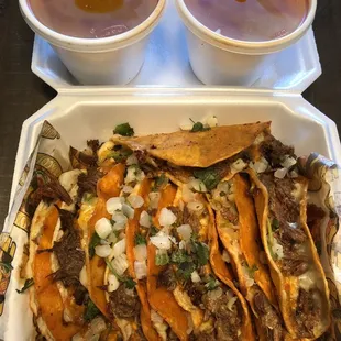 Birria tacos and consome