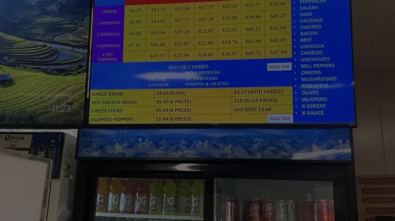 Huge Fast cheapest slide of pizza in the east side. The service there is amazing friendly One slide with any tops u want extra tops are additional.