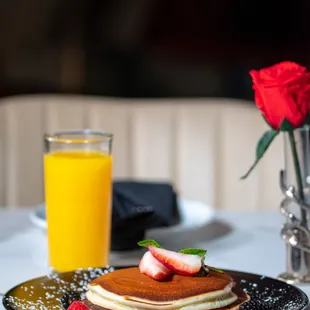 a plate of pancakes, bacon, eggs, and a glass of orange juice