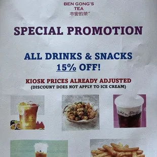 Every time I come to this plaza, I always have to pass by Bengong's Tea! I think the drinks are fine for the price. We did get offered a 10% discount, and they have a wide selection to choose from compared to others along the same strip. The peach oolong was not too sweet, so I could still taste the notes of tea. It had a nice heap of whipped cream which I could tell was freshly made. There is seating both inside and outside, very clean. And I appreciated the sign in front of the entrance with pictures of the top 6. Makes choosing a lot easier!