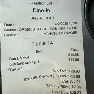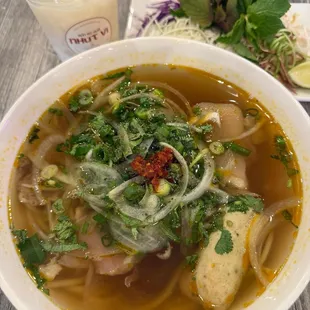 Bun Bo hue 20% off for dine inFree iced tea found at self serve station.Also stocked for Togo items which is a nice option for patrons.Output time was super fast as typically found in soup spots .Noodles were cooked perfectly and soup was good. Totally forgot to add their chili oil.Quality is great, fresh herbs, and plenty of proteins.