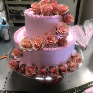 a pink and white cake