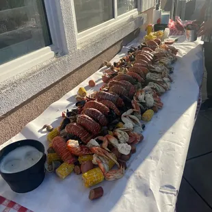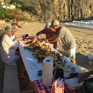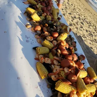 Beautiful presentation of Clambake OC's seafood bake on the beach.