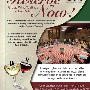 5 star experience!! My husband and I did a wine tasting today at "De Falco Family Food & Wines" in Fountain Valley. It was SO much fun, and we both really loved the wines. We also took advantage of their food market. Owner & Operator, GUS made the tasting session so fun & informative, and Anastasia coordinated everything with the best customer service! I highly recommend you check this hidden little local gem out....Their wines are major award winners (hand-crafted Italian wines) for many years! You will see & taste why....And we are excited to indulge in their homemade Italian Entrees (flash frozen and ready to heat) pastas, sauces, and famous cookies as well. https://defalcofamilyfoods.com/"