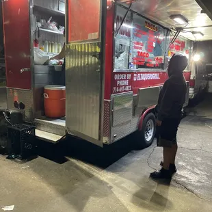 Located on Grand Avenue, not far from a 7/11 and the freeway. Spacious parking, non-busy area. Condiments are self serve (salsas, lemons, salt, radishes) Truck lit brightly and has a lot of open space around it.Staff is friendly, time can use improvement (10 tacos in 9 minutes) and pricey (almost $20 for 10 tacos) Phone orders accepted, cards accepted (no fee if higher than $10) Meat and limes were really juicy and good. They ran out of horchata so no drink bought. Green salsa tasted really good, red salsa had a kick to it which was great. Come here if ya want some good quality tacos!