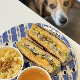 Nice little grilled cheese place! Got the Philly cheese steak grilled cheese with a side of tomato soup and mac and cheese. Everything is fresh and hot. I like that there's customization and a set menu for ease of ordering. Parking is a bit busy but nice place to eat for lunch time. Friendly service as well :)