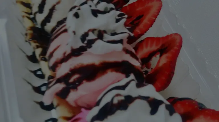 a waffle with ice cream, strawberries, and chocolate sauce