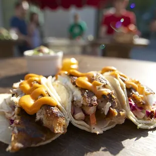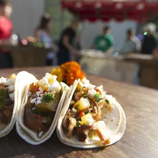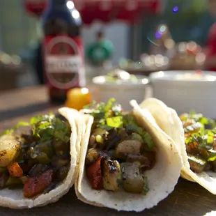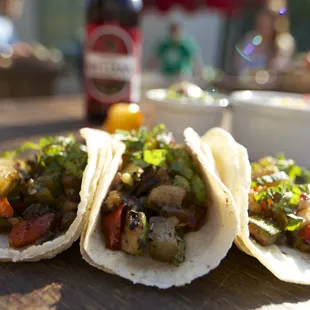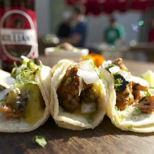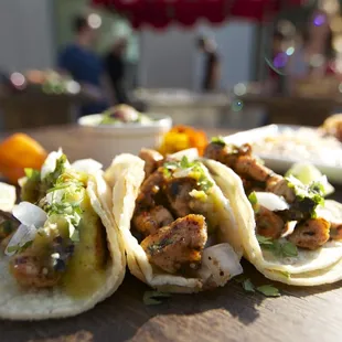 Went to an event a week ago that hired these dudes to make sure people didn't get too drunk-on-an-empty-stomach.Not sure how the pricing typically goes as I simply attended the event. In this instance, it was $5 for a wristband that gets you all-you-can-eat tacos. I wasn't expecting a whole lot after reading the first review here, but holy cow! These guys do work!Meat appeared to be pre-cooked and then reheated on a portable, flat-top, cart like griddle. I can understand being taken aback by it not being served 'fresh' as in, raw then cooked in front of you fresh, but their recipes wouldn't be as tasty, efficient, and economical if they didn't do it the way they do.Carne asada was pretty, I hate to say average, but it was. The chicken they do in some kind of sweet jerk style, is incredible. Really. I opt for carne over chicken 10 times out of 10 - this was the one exception. Thoroughly impressed.Salsa was a bit on the mild side, but I'm the guy that needs to be sweating from spiciness to say it's just right. Squeeze of lime on the classic flat top cooked, double corn tortilla makes this 4 stars easy. +1 star for the guys working the stand being extra incredibly mellow and curteous - and happy to cook extra tacos even though their time was up.*Also noticed them pack-up the leftovers and leave them at the event with no fuss at all.