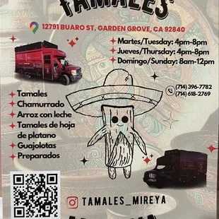 *********LISTEN UP ORANGE COUNTY!!******THE BEST TAMALES IN TOWN HAS OPENED UP THEIR OWN TAMALE TRUCK IN GARDEN GROVE!!!"Tamales Mireya" has been my Tamale Lady for years!! Every year during Christmas I order over 130 tamales to pass out to my neighbors and they all go crazy for them! One time we had a tamale party where we all agreed the tamales I brought mine from "Mireya Tamales" and they were the best compared to the rest! They are so damn good that every time I try to eat tamales elsewhere, Im disappointed and they can never compare to my home made tamales made by Mrs. Mireya. They are in Garden Grove and you can call ahead if you want to put in a big order. They accept Zelle or Cash. They are there Tuesdays, Thursdays (4-8pm) and Sundays (8am-12 noon). While you are there, you must try the Arroz Con Leche or Champurado! Hits the right spot when you eat your tamales. My personal favorite is the green chili chicken!! Then the pork with red sauce and then the jalapeño with cheese. I don't like spicy. But my family LOVE the jalapeño and cheese that like spicy food. They now added a new tamale to the list. The Mole with Chicken! OMG that sounds so good but I was told that's the first one that sells out so I need to go back earlier when they open so I can try them. I don't care what city you are in.... IT'S WORTH THE DRIVE TO GO THERE WHEN THEY ARE THERE! And if you need any other day, call them direct and you can pick up from them. I usually pick up at their house in Buena Park. YOU WILL BE RUINED AFTER YOU EAT THESE TAMALES AS ALL THE REST WILL NOT COMPETE! She uses quality masa, quality meat and stuffs the tamales with meat! The masa is not the greasy kind that usually gross me out. These are honestly the BEST TAMALES YOU WILL EVER HAVE! Just Google the address 12791 Bustos St., Garden Grove, Ca 92840. They are there Tuesdays, Thursdays nights and Sunday mornings till noon. The truck is parked on the street. There are two trucks parked next to each other. You can't miss it. It's $33 a dozen. You might as well buy two dozen to save yourself a trip. They can be frozen.