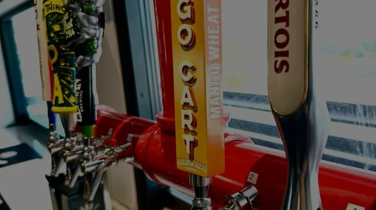 a row of beer taps on a counter