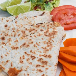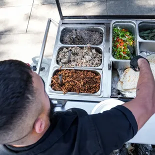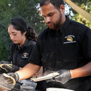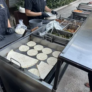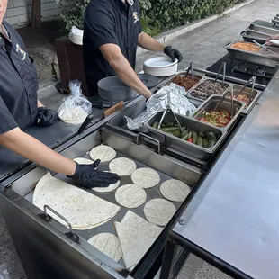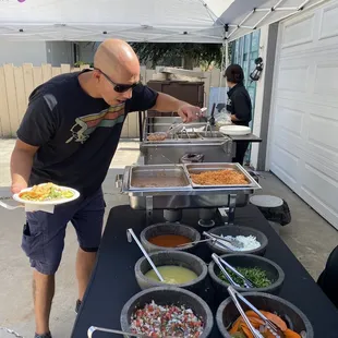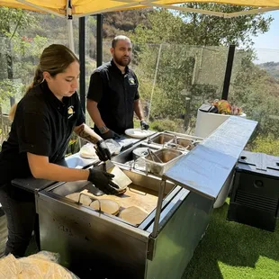 Andy and Victoria were terrific and provided excellent service. They were awesome and worked hard to make the food for our guests. The food itself was fine; the chicken is shredded chicken (wish it was grilled pieces) and the carne asada seemed like low quality red meat; we got the shrimp upgrade and also veggies which were both good. The rice and beans were good and the salsa bar was well-presented. We paid for the upgrade of having meat quesadillas but what was actually served was pre-made cheese quesadilla with your choice of meat placed on top. It wasn't actually a meat quesadillas that you'd expect (like a chicken quesadillas would have chicken and cheese between the tortillas--this was just cheese quesadilla between the tortillas). A few things could have been handled better: (1) ordering process was difficult with long delays in getting responses from the coordinator; there were also mistakes in the quote provided and unnecessary follow-ups as a result but the coordinator was very nice and honored their original quote. (2) the Guacamole is "free" but they don't bring enough. We ran out early in the process (like 30-45 minutes into the 2-hour service). What's crazy is that we only had 50 guests show up due to last minute cancellations and no-shows but had ordered for 63. I wish they had told me that they typically run out of guac (as the servers told me which indicates they don't bring enough) so I could have paid more for the guac and not run out. They actually charged extra for the sour cream believe it or not which was odd but fine because we didn't run out. I didn't mind paying for something as long as we actually get it and it's enough for our guest count. (3) there was no menu at all so most people had no idea that they could order different items (in our case, tacos, mulitas, and quesadillas). I asked many guests whether they tried the mulita and they either said what's that or said they didn't know they could order that because no one told them. A simple menu to put up on the ledge of the taco stand would be very professional and let people know what they can order. (4) A few hours after they left, I found a box full of tortillas (taco, mulita, and quesadillas sized tortillas) by the wall in our backyard near where they had been serving. By the time I saw it, ants were going everywhere in the box and it was a mess. I think they forgot to put it in our house like the rest of the left-over food. Anyways, this was a decent experience but not the 5-star experience we were hoping to get.