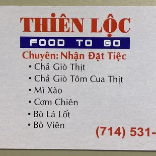 Vietnamese egg rolls, or cha gio, are the best kinds of egg rolls. I might be biased in declaring that since I'm Vietnamese but I find that our egg rolls have better fillings, generously stuffed with protein, and less of the cabbage fillers and things. For my nephew's birthday I was asked me to pick up egg rolls in OC. I was able to call into Thien Loc Food To Go a few days prior to put in my order for 100 Pork Egg Rolls ($70) for 10:30 am. The older gentleman who answered the phone was super friendly and I appreciated that he gave me a reminder that the business is CASH ONLY. He repeated my order and confirmed the information, and everything was correct. On the day of my pick up, I pulled up to the business. They are located in the same plaza as Van's Bakery off Brookhurst. I entered the store and gave them my name and phone number. A nice auntie helped me with my order and she went to the back to grab my order. The 100 egg rolls were neatly organized in disposable trays of 50. She placed foil over the trays with a small opening so that they would stay warm but also had an opening so that steam wouldn't make the egg rolls soggy. Very good technique. The party was over an hour away and yet the egg rolls maintained a crispy freshness. It had good filling and it was a very popular item among the guests. We had sooooooo many other party trays at the party but the egg rolls were definitely the first to "sell out". Yum! Will be back the next time I need more egg rolls for gatherings.