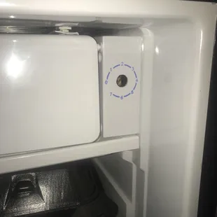 Blinds, no window coverings, crusty carpet with stains, old TV, bad reception No safe, no closet, clothes hanger in main room on wall