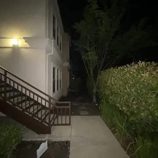 No lighting for creek side apartments- this is where someone used ladder to get to my second story patio to steal our bike!