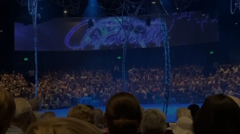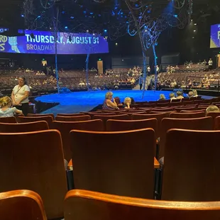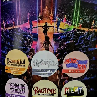 This is a smaller venue than the other Broadway theater. The stage is in the center and the seating is all around. They don't sell merchandise for the shows at music circus. They do have snacks that you can take inside the auditorium such as popcorn, candy, and ice cream. The seats are at a small slant so if someone tall sits in front of you, you may not see much of the show. The isles are really small/narrow too. One thing unique about this theater is the four screens around the auditorium. The shows use them occasionally. For "Rent" the screens were used to show Mark's movie he was working on. For "Cinderella" it was used to show the dragon.