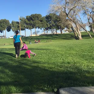 This review is strictly related to the playground which is sequestered away from the main park area and parking area. The park is down a hill near a main street which I find relatively unsafe. Anyway, I took my niece here a couple of weeks ago during the week and a few ghetto teenagers were hogging the playground and cussing loudly. Mine you, my niece is 3 years old and last time I checked those teens should be in school and playgrounds are for children. Not to sound like a bitter old hag, but my poor niece was starting to get frustrated that she couldn't go down the "big slides" because the big kids were hogging the bigger part of the playground.Additionally, the playground was completely filthy. Literally trash everywhere you look. Disgusting! This is where children play and this is how a public park is kept up? Fortunately, an employee appeared out of nowhere to begin picking up garbage but it looked like the park hadn't been cleaned in ages according to all the trash that was around. I only took my niece here because it's close to home but there are many other safer and cleaner parks around the area that I would rather venture to than here.