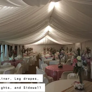 Reserve a tent today! Shown here with liner, leg drapes, bronze chandeliers, and right side clear sidewall!