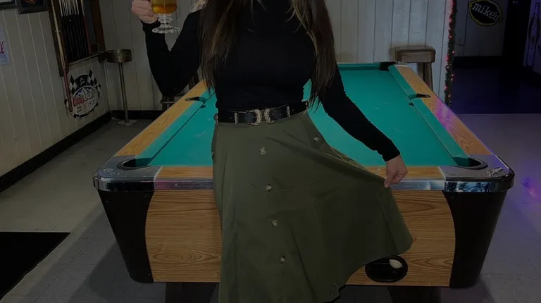 a woman holding a glass of beer in front of a pool table