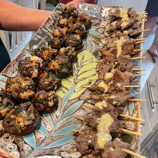 Sausage spinach stuffed mushrooms and Garlic Mustard Steak Skewers. The beef skewers were so tender and good.