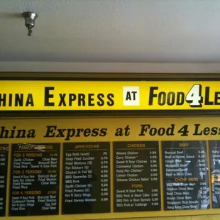 China Express is located in Food 4 Less grocery store, you could order on the menu or have take out ready cook items for 6.95 for 3 items Chow mein Steam rice Fried Rice Garlic chicken Chicken wings in Sweet chili sauceCha Chu broccoli w beef Chicken w Vegs Sweet & sour chicken or pork moreCustomer serviceFood hot & readyClean kitchen Best Chinese food 5 Stars