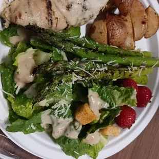 Lasagna, Tortellini, pesto chicken/tomato mozzarella skewer, Caesar salad, bread, grilled veggies. Dessert.