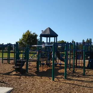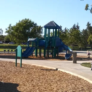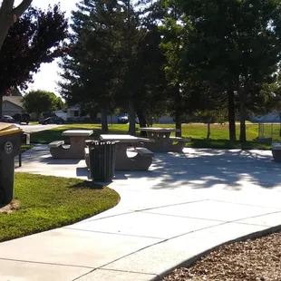 Cute park with nice structures. Large and small (separate) playground structures. Sidewalk goes all the way around the structures for those who like to walk while their kids play. 4 picnic tables. No swings. No bathrooms.
