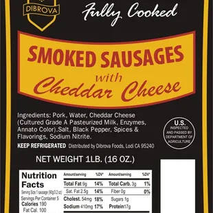 Dibrova foods sells "healthy" sausages.locale: old oaktown farmers marketmenu: sausages: 4.75-5.75. sausage by the package (lb-6)sampling: octoberfest bratwurst (jumbo, 5.75) with the works-heaping full of white and yellow cheeses, relish, mustard, jalepenos -one serving sausage, 190 calories, 9 gram fat, 3 gram saturated, 54 mg colesteral, sodium 410 mg. protein, 17 gram. sugar, 1 gram?.*didn't taste fat, was tasty.foodnotes:-pretty tasty dog, good value-sausage available at star grocery, 3068 claremont ave. oaktown.-skipped their lunch special which included chips & soda.*told them these items weren't "healthy"*both salepeople agreed. only their sausages were "healthy" , they said.-sausage is manufactured by dibrova foods.