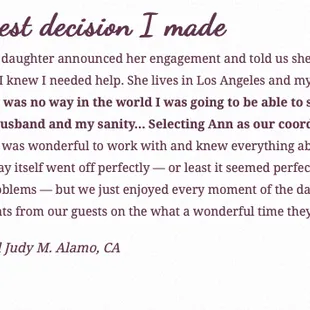 Ann planned a 40th Surprise Birthday party for my wife in San Francisco. The event turned out to be one of the most memorable events for me and my family. Her attention to detail was great! She thought of things I wouldn't, while keeping in mind all the things I envisioned. She was most valuable the day of the event dealing with small mishaps and timing changes. She was very easy to communicate with, and was available by email or phone whenever I needed her. I would highly recommend her to anyone planning an event.