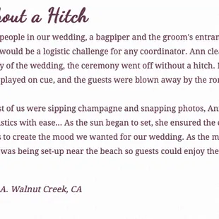 Ann Saavedra was our day-of wedding coordinator. Our wedding was a great success. I felt that Ann was not adequately detail oriented for the size and complexity of our event, although ultimately everything turned out great.Pluses:1. Ann is friendly and professional. She made me feel special during the planning process. 2. We technically had not paid her for wedding planning- only for the day of coordination - but she was happy to meet with me at length before the wedding and also met with the florist and my sister who was involved in the planning. She made a special site visit and made helpful suggestions to my sister.3. Ann appears to be very experienced. She thought of issues to consider during the wedding planning which I never would have thought of including considering how to position readers in the ceremony seating arrangement, where parents most likely should sit, etc. She similarly gave helpful suggestions for the order of the procession. She recommended making lists of people to pick up centerpieces, leftover cake, and other equipment from the wedding so that the day of went more smoothly. I felt that her suggestions helped us feel more relaxed on the day of the event because many things were "taken care of."4. When my sister discovered at the last minute that the chairs that arrived were incorrect, Ann spent time with the vendors and helped correct the problem. Behind the scenes, she took care of everything and I didn't even know about it. Minuses:1. During the pre-wedding preparation periods, I started to notice that she failed to read most of the emails I sent her or CC'ed her on to update her on changes in plans.2. At the rehearsal I was shocked to find that she had a beautiful timeline and outline of all the details of the wedding which she didn't seem familiar with (I heard her daughter puts the packet together for her). She was inefficient in conducting the rehearsal due to lack of familiarity with the details.3. The day of the wedding she was often not present or readily available, even when we called her cell phone. 4. She failed to make sure corsages and bouquets were available for the photos even though we followed her timeline so she should have known when to bring them. 5. I heard afterward that she snapped at a family member who came to kindly ask why the candles for the ceremony had been removed. 6. When the time of the bouquet toss came I realized that she had not made the toss bouquet available to me and she was unavailable at that time. I ended up using my real bouquet which luckily i was ok with parting with.Overall, I will say this- my wedding turned out beautifully. I didn't feel that this was really because of Ann, but I think that she may have done some behind the scenes work that helped. There weren't any major disasters, but I wondered if she would have been able to handle it if there had been. A simpler and smaller wedding may make for a different story. In addition, her strengths may be more in helping with the planning process than in the hectic day of coordination.