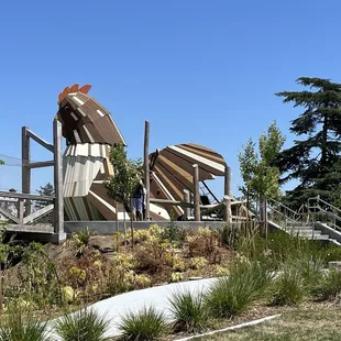 Emma Prusch is my son's favorite park! I highly recommend Emma Prusch because it is very family-friendly and entertaining for the kids. The best part? It's free! No parking fee.Because of the big chicken slide in the center of the play area, my son calls it the "chicken park". I know it is technically a rooster, but the word "chicken" stuck. They have lots of signage saying the tunnel slide attached to the chicken is temporarily closed, but I still saw quite a few kids going down it. It's so huge that you can see the structure from the highway connecting ramp between 101-N and 680-N.Fair warning, all the slides are all made of metal, so they can get hot pretty quickly on a sunny day. There are plenty of swings for the kids to enjoy, ropes and hills to climb, and nice squishy cushioned flooring.The park has plenty of tree shade and benches along the side of the playground area. They also have picnic tables that you can reserve for birthday parties or gatherings. I should also mention they have public restrooms (a must-have with little kids).The barn animals and farm area is gated off and can be easily accessed by families with strollers. It can get pretty dusty inside from the dirt being kicked up by everyone walking around. I would recommend close-toed shoes inside this area, since it houses live animals and there can be fecal matter lying around. Inside the barn area, you can observe rabbits, pigs, peacocks, chickens, turkeys, and goats.Off to the side of the main entrance, there is a flower and vegetable garden that has some small garden toys for kids to play with. They also have a fruit tree botanical garden you can peruse. The surrounding trail that encircles the whole park is a great scenic walk. I love the little gazebo on the far end of the trail. It gives me a little bit of wedding ceremony vibes.Overall, Emma Prusch Farm Park has so much to offer. It really immerses you in the farm and nature aspects of life.