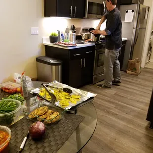 Chef Mathew teaching plating technique at an in home lesson/4 course dinner.