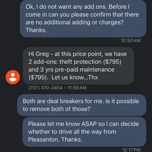 Potential buyers beware. If you get an online quote, there may be additional charges for add-ons. I was concerned when I got that initial message that suggested that I do not complete the purchase online, now it is clear why.Update: found this in my SPAM folder with the "One True Price" offering "without having to haggle or play any of the games." Others can decide whether quoting a low price, but then adding $1600 in add-ons is "True" and whether this dealership is "playing games." I just want others to be aware of my personal experience.