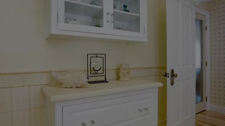a hallway with a bench and cabinets
