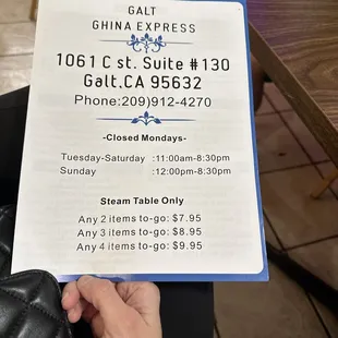 Want a easy and quick lunch? This is the spot. I went in after my Savemart trip and got a 3 item plate for 8 bucks. The lady packed it really hefty and I was in and out within 5 minutes. I almost felt like I was ripping them off for the price and portion. The place is tidy, maybe about one or two tables for seating. The food is served like hot lunch kind of similar to Panda Express. There were a good amount of options to choose from your orange chicken, veggies, to sweet and sour pork. I saw that Galt China also does catering! The food here is delicious! My chow mein, orange chicken, and general chicken was bomb. I was skeptical at first but I got to give them credit for price and quality.I will definitely return here for Chinese food.