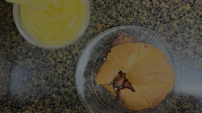 Egg bacon and cheese croissant paired with a 16 ounce coffee with oat milk.