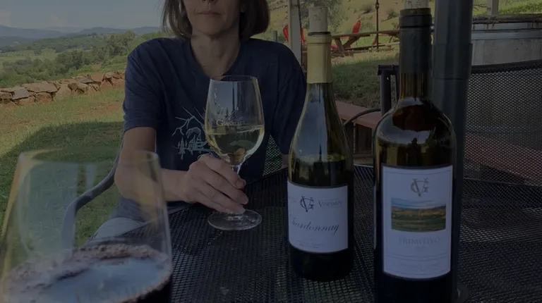 On the patio enjoying some Chardonnay and Primitivo.