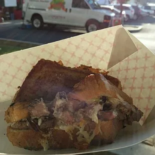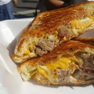 These guys are super nice. I love that when you're standing around waiting for your food, the cooks are outgoing and fun to be around.I believe the Hardy tent is at the Modesto Farmers' Market weekly. It was awesome to be able to get a hot grilled cheese sandwich filled with freshly grilled tri-tip after a long morning of shopping and lugging around heavy vegetables and market products. I had to wait about 30 minutes because the tri-tip wasn't done yet. They asked if I was willing to return back to the tent and I was - so I continued to shop some more at the farmers' stands. It was well worth the wait. The sandwich can totally be shared. I gave the other half to a homeless vet who was nearby, and I was still full.Next time, I think I'd want a half pound of the tri-tip and eat it all by itself.They do appear to accept credit cards.