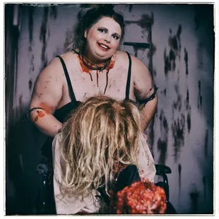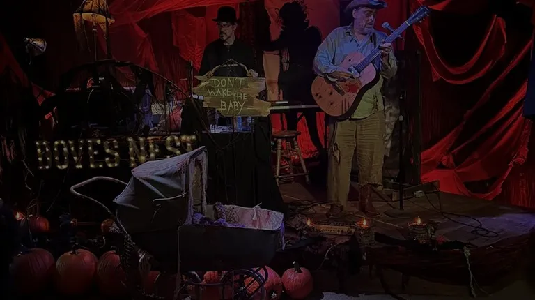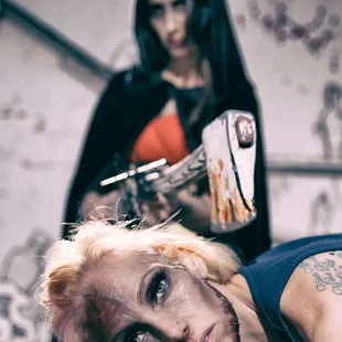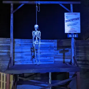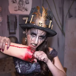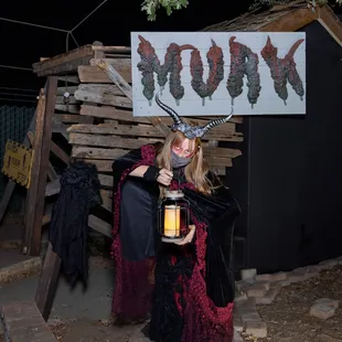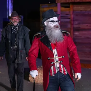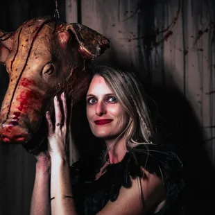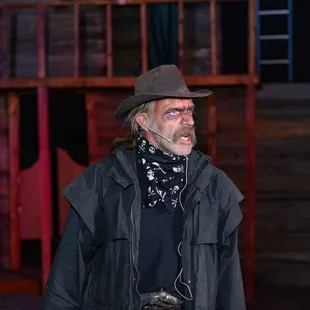 This is a fun event to attend during October. Before you even go in the building for the scares, there is stuff to do. There are actors in costumes who walk around outside the building. There are some children in on this too (in costumes). There is a 10 minute saloon show that goes each hour. I'd recommend getting the earliest time slot since you can go in later, just not early. They do check your bags and have a metal detector before you can enter. Once inside, there are 4 different scary themed rooms to enter. One is indoors. The rest are all outdoors. The themes change each year. The one indoors was hospital themed. The actors for that one were really fun and committed. One of the outside ones was an underground maze in the dark. We were in a group of 6 and the split us up. We kept getting lost and couldn't see anything. This one was the scariest for me. One was western themed and one was witch themed. They don't allow photos inside the scary themed areas so photos were limited. They did have a pillory (the stocks) outside which was cool. Even when you're not in the scary rooms, the actors will wander around looking for a scare. One guy dressed as a bird slid into a photo with us (seen below). They don't have much merchandise to buy. There are stickers and magnets. They have a few vendors inside too and a psychic. There are a few food trucks outside next to the entrance.