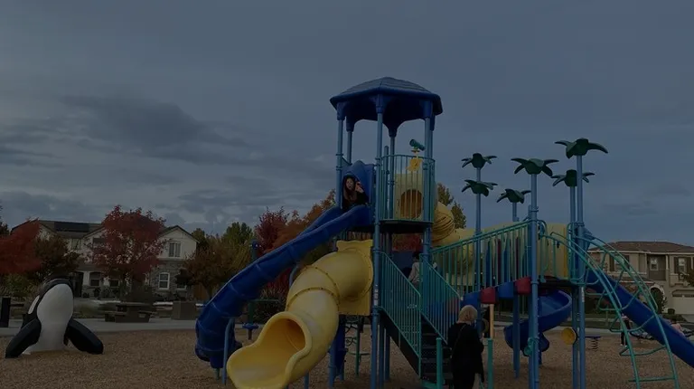 New park with two large play areas charming island theme. Parking on the street on a round about.No bathrooms, shade is limited, trees are still young but should bring more shade as they mature. Sand bar and grounds are decorated with sea creatures. Two tables are covered and there are no BBQ pits. Watch out for the tiny spiders they are everywhere. Nice area and safe location.