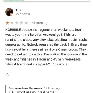 HORRIBLE course management on weekends. Don't waste your time here for weekend golf. Kids are running the place, very slow play, blasting music, trashy demographic. Nobody regulates the back 9. Every time I come out here there's at least one 6 man group. They need to get a grip on this. I've walked this course in the week and finished in 1 hour and 45 min. Weekends takes 4 hours and it's a par 62. Ridiculous.(My response to the owners comments after I made review on Google maps..) Received a poor review after I gave an honest review. I'm the customer, simply shared my experience. I've played Jack Tone a lot of over the years. Always have had slow play times on the weekends but not like it's been recently. Especially this past weekend (5/13/23). I do not appreciate the salty response from the owner, who from my understanding, doesn't come in often and doesn't live in the area. I spoke with a young man named Josh this morning on the phone who informed me on the owner. The owners reply was incorrect as well. I made my comment on the 16th whole, had another 35 minutes of play after that response. So my total play time actually exceeded 4 hours. Any other course I wouldn't have thought twice about it. But this is par 62 Jack Tone, Cmon now. And I didn't pay $16, I paid $23 per player PLUS $16 for the cart. Which by the way other nicer Course usually charge $15. I get that Jack Tone is make improvements, and making an effort to fix pace of play. But having someone stand with a tablet on the first hole isn't going to cut it. The players bunch up at the 10th hole, everyone knows that. The back nine is where the regulating needs to happen. I spoke with another young man immediately after the round, looked very young. He rolled his eyes at me several times while I respectfully explained how there were several groups of 6 out there and how one of them kept blasting music and how the other group kept hitting into us. I know there's not much he could've done, but the attitude and tone was very disrespectful. I'm expecting a phone call from a "Shauna" soon. I'm not looking for a refund, I just want to be met with respect and to be heard. I would very much like to speak to the owner in person, big tough guy who "won't use my name". I don't need the sarcasm man. I like the course, but I'm thinking about maybe not coming back. And my friends and family who regularly golf with me won't be coming back either if this situation doesn't improve.