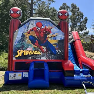 Spider-Man 6in 1 Combo Unit -Features: Bounce house, basketball hoop, pop up characters, climbing wall, slide (wet/dry), & optional pool.