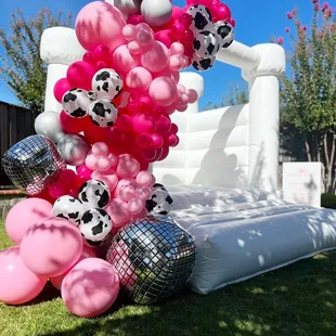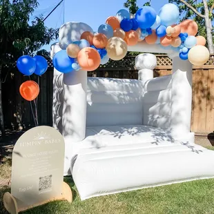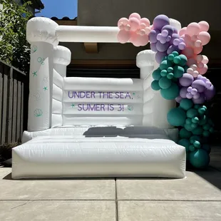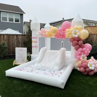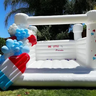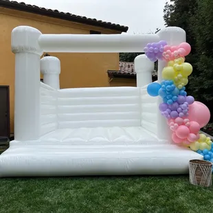 White bounce house with balloons by Poptastic parties