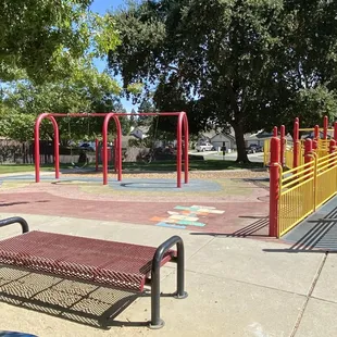 Love this park and its fire red & yellow play structure. My kids runs up and down the ramps to the two slides. This Park also has a sandpit, a firetruck, a wheelchair swing, a set of swings and one covered table for picnicking. We come out to kloss once a week for an hr. mommy workout, the kiddo loves this park every time we drive up to it.Plus they have bathrooms!Best part are fire trucks and the firemen next to the park. All the kids stop and stare as they go by!
