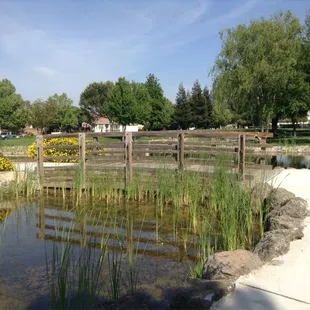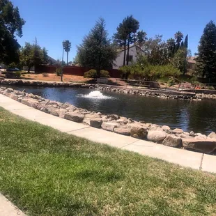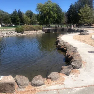 This place is a pretty nice, quaint neighborhood park. Not your usual play place for children since there's no playground. Sufficient shaded grass area and some tables. The little lake/pond and mini waterfall are a nice touch. Be much better tho if it was cleaned. Cute from afar and would make nice photo ops.