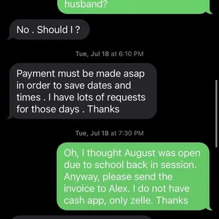 DO NOT WASTE YOUR TIME. Lisa is beyond unprofessional. She demanded to be paid up front, because she was so booked. However, countlessly had excuses for last minute cancellations. We wouldn't find out she's wasnt coming until WE REACHED OUT TO HER. Today was her 4th cancelation. Lisa is a total fraud. She only communicated via text. See screenshots below. I'll post more since my husband also communicated with her.As of today, she has responded to my review and non of our texts requesting for a refund for her failure to keep her end of our agreement. Lisa, these aren't feelings they're facts. Facts that prove your unprofessionalism to take accountability for your actions that created unsatisfied experience for a customers. Do better, trying is an excuse.