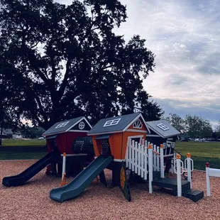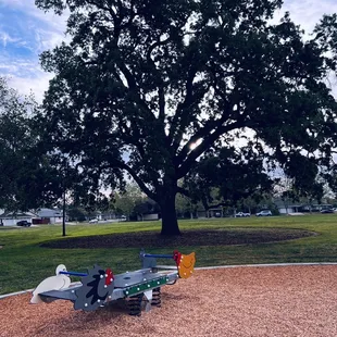 Fun park with interactive, learning play equipment for 2-5 year olds. Large climbing structure for older kids. Lots of grass, trees, benches, gender neutral bathrooms, changing tables for baby, picnic tables. Basketball, baseball, Bocce ball and volleyball areas. Clean and well taken care of.