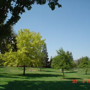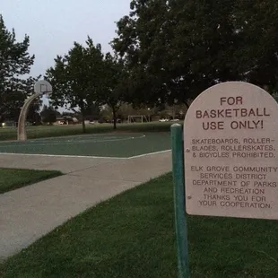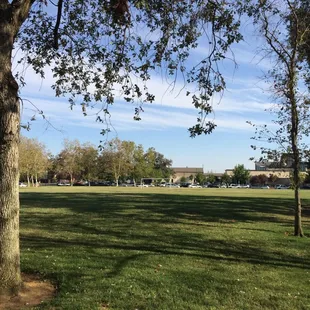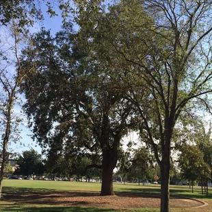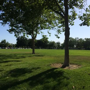 Nice beautiful trees. A playground for the kids. A basketball court at the South End of this park. A volleyball net for volleyball players. A pathway where people can be seen walking their dogs, running or simply hanging out. A couple of benches scattered throughout the park. An open soccer field at the front or what I consider the front of the park. No bathroom facilities by the way.