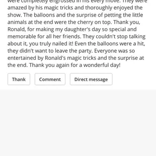 Amazing, kids loved him. Both Magic and balloon twisting are good.Magic Ron engaged with the kids so much. Both kids. and adults enjoyed it a lot.