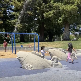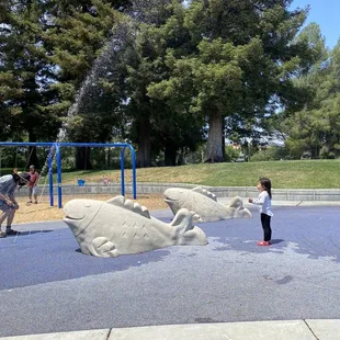 I've been coming to this park for years. First, as a kid myself and now as a parent.This park is great because it has so much room to roam around. Large grass areas divided by pathways make it easy for different groups to do different things. Lots of shaded areas makes this a great park for picnics, or just hanging out too. There are no restrooms or drinking fountains here, but in a pinch you can use KI Jones' fountains when school is out and the gates are open. Otherwise, bring that H2O goodness from home. What really sets this place apart from your average park (and thus earns it a 4-star rating from yours truly) is the water cannons! How awesome is that? I'm just jealous they weren't around when I was a kid! The area surrounding the water cannons is covered with a spongy material that provides better traction and padding when wet than cement. To conserve water though, the cannons are only on from Memorial Day weekend to Labor Day weekend; so check your calender if you've got kids in swimsuits who wanna splash. My daughter loves this park and it gets PACKED after KI Jones gets out during the week. Lots and lots of kids for a good hour or two at least, my daughter loves it! If you bring your kids here they'll love it too. Don't forget to check out the creek before you leave too, if you look in the right spots you'll find craw-dads and little fishes. If you're fast enough you can even catch one of the craw-dads to have a closer look, just don't get pinched!