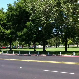 Cute park for kids. Has two structures - one for littles and the other for bigger kids. Regular and baby swings. 6 benches around the parks. Very large open grassy field next to the park. A little further down from the playgrounds is a covered picnic table shelter area and some bathrooms. Bathrooms are far enough away from the playgrounds to where the homeless aren't right next to where the kids are playing.